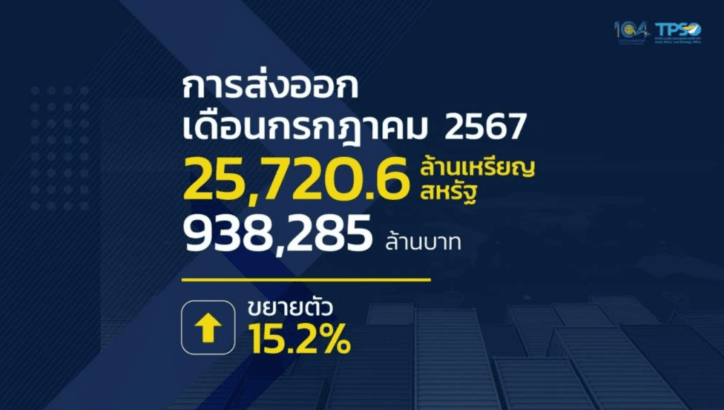วันที่ 27 สิงหาคม 2567 นายพูนพงษ์ นัยนาภากรณ์ ผู้อำนวยการสำนักงานนโยบายและยุทธศาสตร์การค้า (สนค.) เปิดเผยตัวเลขส่งออกเดือนกรกฎาคม และ 7 เดือนแรกของปี 2567 พบว่าการส่งออกของไทยในเดือนกรกฎาคม 2567 ฟื้นตัวอย่างแข็งแกร่ง โดยมีมูลค่า 25,720.6 ล้านเหรียญสหรัฐ ขยายตัว 15.2% นับเป็นอัตราการเติบโตสูงสุดในรอบ 28 เดือน นับตั้งแต่เดือนมีนาคม 2565 หากหักสินค้าเกี่ยวเนื่องกับน้ำมัน ทองคำ และยุทธปัจจัย ยังคงขยายตัว 9.3%