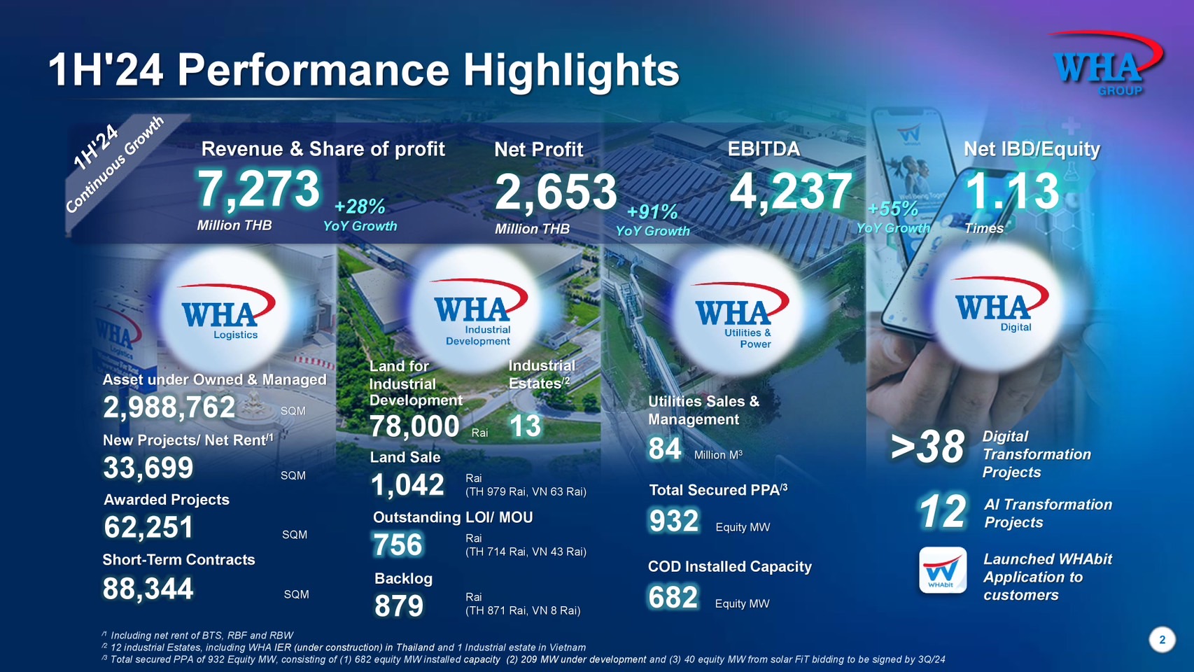 วันที่ 11 กันยายน 2567 นางสาวจรีพร จารุกรสกุล ประธานคณะกรรมการบริหารและประธานเจ้าหน้าที่บริหารกลุ่ม บริษัท ดับบลิวเอชเอ คอร์ปอเรชั่น จำกัด (มหาชน) หรือ WHA กล่าวว่า ทิศทางธุรกิจภาครวมในช่วงไตรมาส 4 และภาพรวมครึ่งหลังปี 2567 ของเรามีแนวโน้มที่แข็งแกร่ง ด้วยการมุ่งเดินหน้าตามกลยุทธ์และพัฒนาแนวทางธุรกิจให้สอดคล้องกับเมกะเทรนด์โลก โดยเฉพาะการย้ายฐานการผลิตและลงทุนสู่ภูมิภาคเอเชียตะวันออกเฉียงใต้ การนำเทคโนโลยีมาปรับใช้ รวมถึงการดำเนินงานด้านความยั่งยืนอย่างต่อเนื่อง