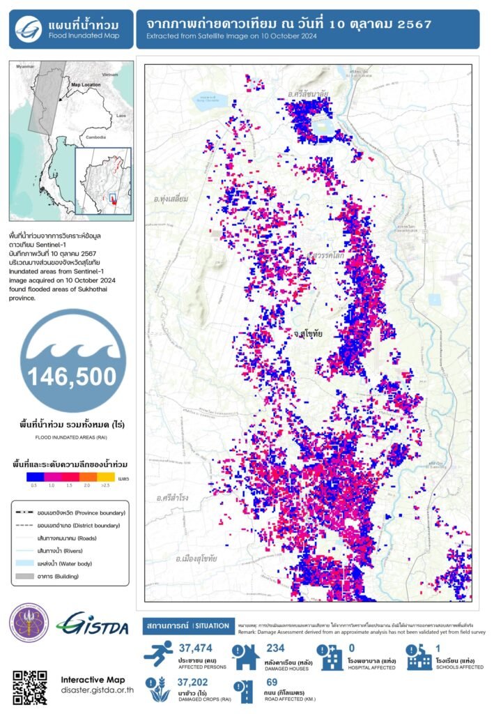 วันที่ 10 ตุลาคม 2567 สำนักงานพัฒนาเทคโนโลยีอวกาศและภูมิสารสนเทศ หรือ GISTDA กระทรวงการอุดมศึกษา วิทยาศาสตร์ วิจัยและนวัตกรรม (อว.) เปิดเผย สถานการณ์น้ำท่วมด้วยข้อมูลภาพจากดาวเทียม Sentinel-1 ของวันที่ 10 ตุลาคม 2567 พบน้ำท่วมขังในพื้นที่บางส่วนของจังหวัดสุโขทัย รวม 146,500 ไร่ ส่วนใหญ่เป็นพื้นที่ลุ่มเกษตรกรรม ชุมชนที่อยู่อาศัย และเส้นทางคมนาคมบางแห่ง
