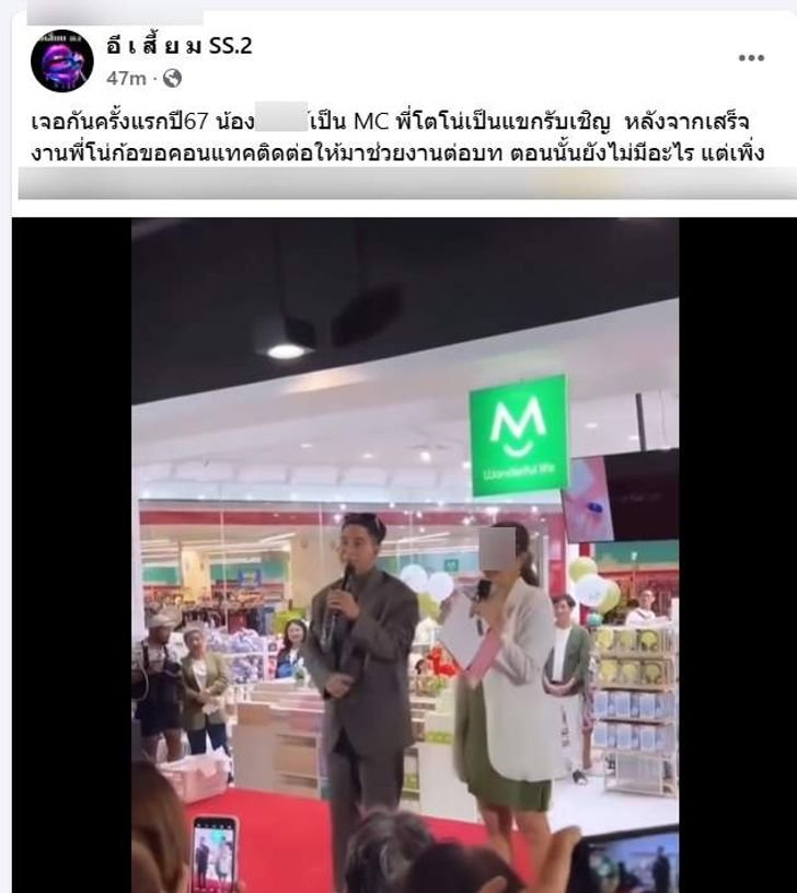 คลิปวิดีโอที่ถูกโพสต์โดยเพจเฟซบุ๊กชื่อดัง อี เสี้ยม SS.2 เผยให้เห็น “โตโน่ ภาคิน คำวิลัยศักดิ์” ร่วมงานกับหญิงสาวคนหนึ่งภายในศูนย์การค้า โดยมีการระบุว่า ทั้งสองพบกันในงานเมื่อปี 2567 ขณะฝ่ายหญิงทำหน้าที่เป็น MC และ โตโน่ เป็นแขกรับเชิญ หลังจบงาน โตโน่ ได้ขอคอนแทคเพื่อชักชวนมาทำงานร่วมกันในโปรเจกต์อื่น